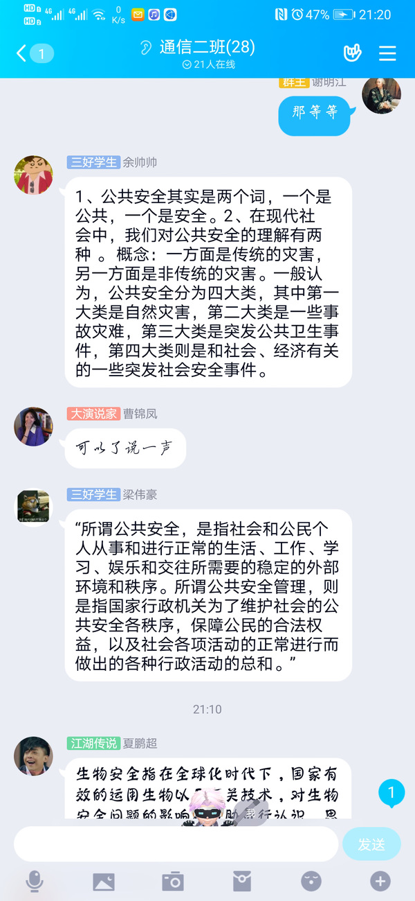 同学们通过QQ群课堂群直播主题“云”班会、QQ群在线讨论、分享学习视频链接等开展学习,积极交流分享学习心得体会。