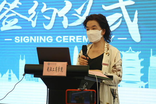 武汉工商学院校长熊蕊发表讲话。她动情地说,两所大学因为特殊的背景而结缘,教育部启动“一帮一”行动是对身处疫情震中的武汉各高校的有力支持。她代表学校全体师生,向对外经济贸易大学给予的关心和帮扶表示衷心感谢。