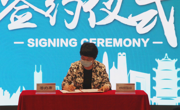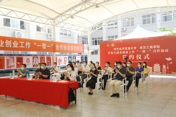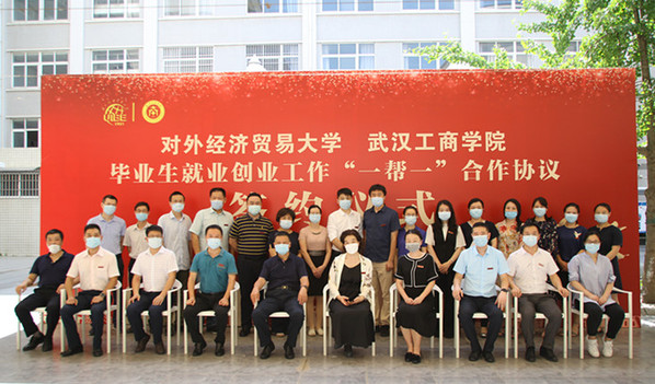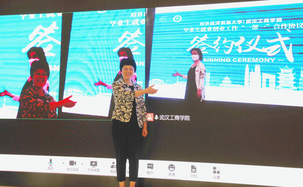 会上,对外经济贸易大学党委副书记文君与武汉工商学院校长熊蕊共同签订《对外经济贸易大学与武汉工商学院毕业生就业创业工作“一帮一”行动协议》,并通过两边会场的大屏幕实现了“云握手”。