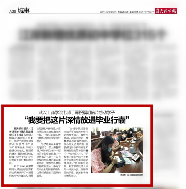 楚天都市报讯(记者潘锡珩 通讯员蓝静 李洋洋 彭宠)按照错时错峰、自愿原则,6月18日,武汉工商学院迎来首批返校的347名2020届毕业生,学校以最暖心的方式、最细致的服务、最饱满的热情,让每一位学子在这个毕业季留下美好难忘的回忆。 18日7:00,在蒙蒙细雨中,该校校长熊蕊和师生代表举行了一场特殊的开学升旗仪式。当雄壮的国歌声奏响时,大家深情注视五星红旗冉冉升起,一起祝福祖国、放飞梦想,感受大学的美好时光。 为了给毕业生留下美好回忆,送上温馨祝福,学校特地为每一个返校的毕业生都送上了一份特殊的礼物——印有学校四季风景的毕业季明信片。很多教师、辅导员都在明信片上手写了对毕业生的祝福和期待,让他们感受到了别样的温情。 “当辅导员刘芳老师把手写祝福的明信片送到我手里时,我特别感动,四年的时光一幕幕都浮现在我的眼前,内心有太多的不舍,我要把这份珍贵的回忆和深情放进我的毕业行囊中,存在我的心中。”学校电子商务学院电子商务专业毕业生李单泥动情地说,“在四年时间里,刘芳老师就像大姐姐一样关心我,能够做她的学生,我感到十分幸运和开心。”