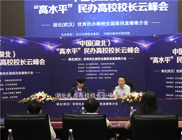 新闻中心讯(记者 李洋洋)“武汉是安全的,是英雄之城,是充满活力的城市,会有更好的发展。”7月21日下午,由长江日报报业集团和中国科教评价研究院联合主办的2020中国(湖北)“高水平”民办高校校长云峰会在长江日报报业集团召开,来自武汉地区的七所民办高校校长在推荐各自高校的同时,自发不约而同推荐武汉,为武汉这座城市代言。本次云峰会直播观看量达21.8万,受到了众多考生及考生家长的广泛关注。