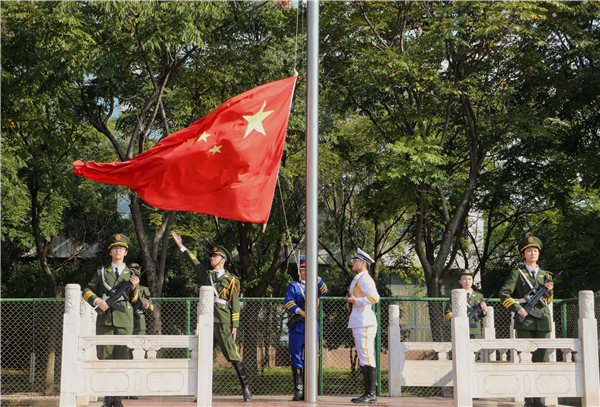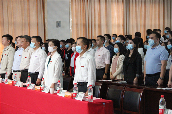 图为大会全体人员起立奏唱国歌观看升旗仪式 摄影:冯哲昊