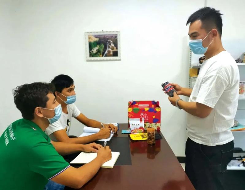 图为库尔班·铁木尔在为同事讲解农产品 摄影: 谢懂飞
