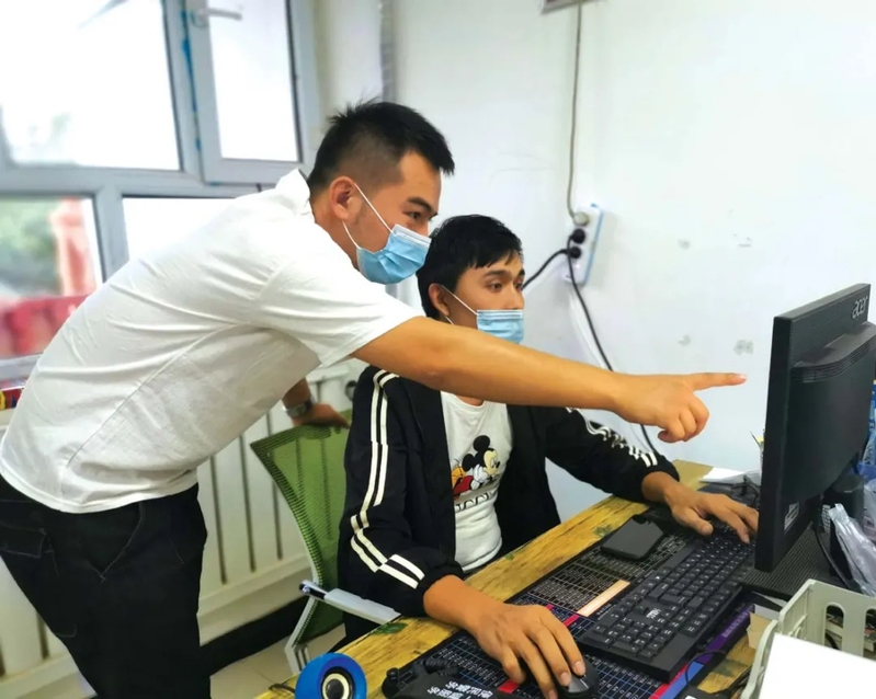 图为库尔班·铁木尔指导同事处理问题 摄影:谢懂飞