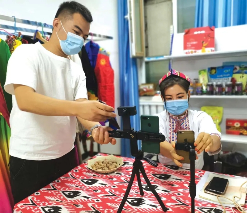 图为库尔班·铁木尔帮助同事完成直播前准备工作 摄影:谢懂飞