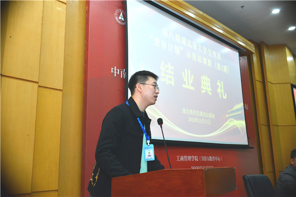 新闻中心讯(通讯员 李珺霞)11月10日-13日,武汉工商学院管理学院余寿勇、张启晗、张俸源3位学生党员代表学校参加了由湖北省委教育工委主办、中南财经政法大学承办的湖北省高校学生党员第八期“双育”(党性教育、能力教育)计划示范培训班(第1批)。在结业典礼上,余寿勇和张启晗两位学生党员作为参加培训的优秀党员代表分别以“生逢其时 重任在肩”和“学思践悟新思想,不忘初心再出发”为主题进行经验交流发言,充分展现了全国党建工作标杆院系——武汉工商学院管理学院的党建工作特色。