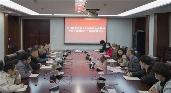 讲座结束后,万美容教授还与武汉工商学院各二级学院的党总支书记、思政课部教师代表和大学生党员代表在综合楼第二会议室进行座谈,对师生代表关于如何学习贯彻党的十九届五中全会精神的问题进行解答与交流。