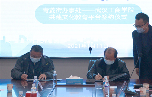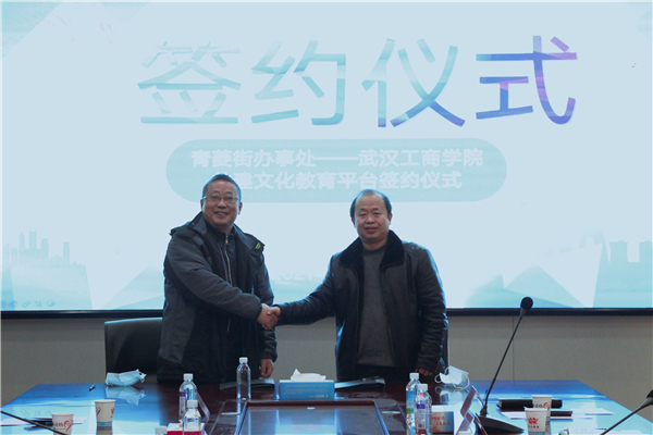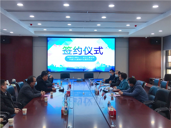 新闻中心讯(记者 李洋洋)1月11日上午10点,武汉工商学院图书馆与洪山区人民政府青菱街办事处共建青菱街社区文化教育平台签约仪式,在洪山区青菱街203会议室举行。青菱街党工委书记何线、区高校办副主任钱文胜、青菱街道办副主任李大庆、青菱街公共服务办主任杨健槐,武汉工商学院党委书记刘生元、校长助理左宗文、图书馆馆长万化喜、图书馆副馆长黎智等参加了仪式。