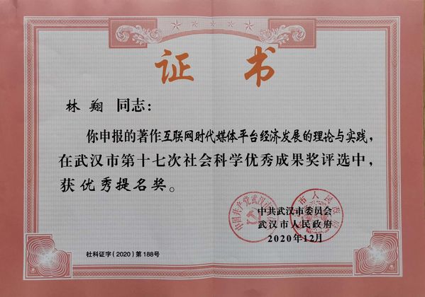 新闻中心讯(特约记者 王敏)4月16日上午,武汉市社科联第六届委员会第六次全体(扩大)会议在武汉会议中心隆重召开,会议为市第十七次社会科学优秀成果颁奖,武汉工商学院文法学院副教授林翔博士专著《互联网时代媒体平台经济发展理论与实践》继上次入选2017-2018年度湖北省高等学校哲学社会科学研究优秀成果后,此次再获武汉市第十七次社会科学优秀成果优秀提名奖。