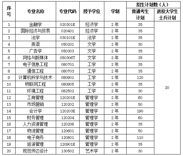 2.退役大学生士兵。应征入伍服义务兵役退役的2021年湖北高校普通全日制高职高专应届毕业生,报考时能如期毕业,服役期间未受过处分;或2020年退役的湖北高校普通全日制高职高专毕业生,已取得普通全日制专科毕业证,服役期间未受过处分。其中,在服役期间荣立三等功及以上奖励的,可申请免试就读我校某个专升本招生专业。