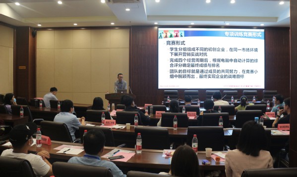 随后,刘庆讲师从“专项赛目的”、“认识营销之道”、“决策分析方法”、“训练参赛指南”这四个方面对专项赛道进行了介绍。刘庆讲师还展示了竞赛的平台主题场景,演示了模拟综合比赛的基础操作。现场与会老师针对于赛事进行了交流提问,郑东琴总经理、刘庆讲师一一做出了解答。