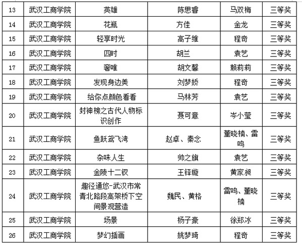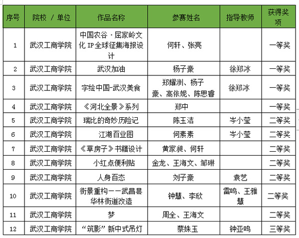 武汉工商学院艺术与设计学院师生作品在本届省赛中共获奖26项。其中,何轩老师和张亮同学共同完成的作品《中国农谷·屈家岭文化IP全球征集海报设计》和郑中老师的作品《<河北全景>系列》获教师组一等奖;徐郑冰老师指导的杨子豪同学的作品《武汉加油》和郑耀洲、杨子豪、高依妮、陈思睿四位同学的作品《字绘武汉—中国美食》获学生组一等奖。