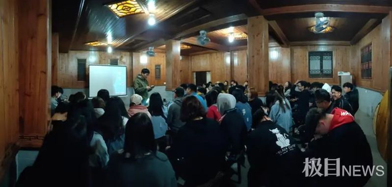 牛学老师夜间在写生基地的食堂为学生们讲课