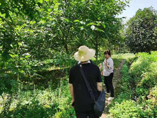 图为工作队一行察看村民沈开玉开发的核桃产业园,了解核桃生长情况