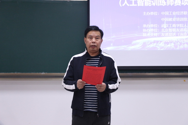 新闻中心讯(记者 盛佳霖 见习记者 赵婵 罗紫怡)11月6日上午,由中国工业经济联合会和中国就业培训技术指导中心联合主办,武汉工商学院人工智能学院承办,北京智联友道科技有限公司协办,北京友道易达科技有限公司提供技术支持的2021年全国行业职业技能竞赛——全国工业经济应用创新职业技能竞赛人工智能训练师赛项湖北省选拔赛在武汉工商学院举行,来自武汉工商学院、湖北交通职业技术学院、武汉中软卓越科技有限公司及其他单位的35名学生、教职工、企业职工参加了此次比赛,经过角逐,最终来自武汉工商学院的学生张轩豪、任奕峰夺得学生组一等奖,来自武汉工商学院的教师吴迪获得职工组一等奖。