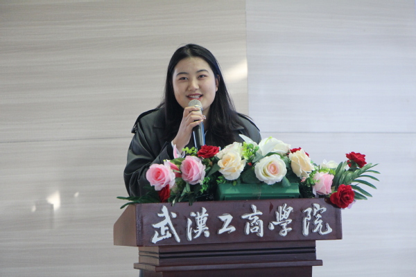 应用技术学院学生音梦婷作为“品牌宣传代言人”学生代表,讲述了今年4月和同学组队回访恩施市第二中学的经历,她分享了自己的三个体会:一是提前联系对接,尽量扩大宣传范围;二是精心准备干货,收集学生反馈;三是团队合作,应对困难。除此之外,音梦婷还引用学校校歌中的歌词“望星辰大海,做长江后浪;弘工匠精神,伴大国成长”,号召更多同学一起努力将品牌宣传工作做大做强,将武工商精神代代传承下去。
