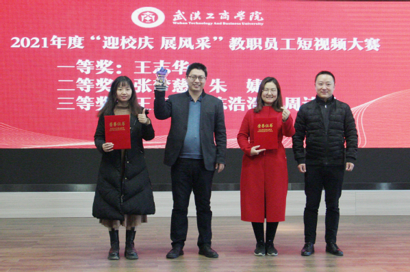 随后,朱宜部长宣读了《关于公布“迎校庆,展风采”——武汉工商学院首届教职员工短视频大赛结果的通知》《关于表彰2021年度武汉工商学院品牌宣传代言人的决定》。张俊副校长、朱宜部长、陈义文部长、蓝静副部长分别为获奖师生颁奖。