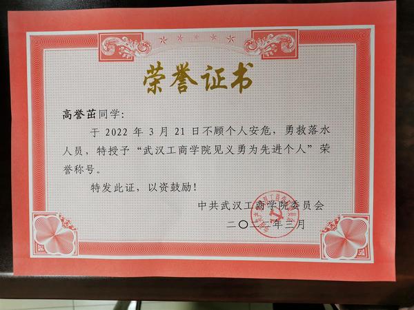 湖北日报讯(记者韩晓玲、通讯员蓝静)“当时看到那个女孩快要被海水淹没,我来不及想什么,就和同事们一起下海救人了。”3月25日,武汉工商学院授予大四学生高誉茁“见义勇为先进个人”荣誉称号。他说,虽然事后想起来有点后怕,但是并不后悔。