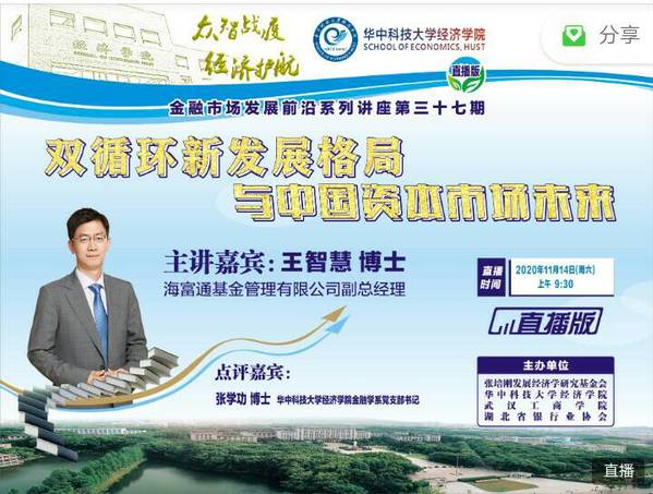 (通讯员 欧慧慧)2020年11月14日,由张培刚发展经济学研究基金会、华中科技大学经济学院、武汉工商学院经济与商务外语学院、湖北省银行业协会共同主办了此次线上直播形式的讲座。海富通基金管理有限公司副总经理王智慧出席演讲,武汉工商学院经济与商务外语学院金融专业的全体师生观看学习了此次直播。