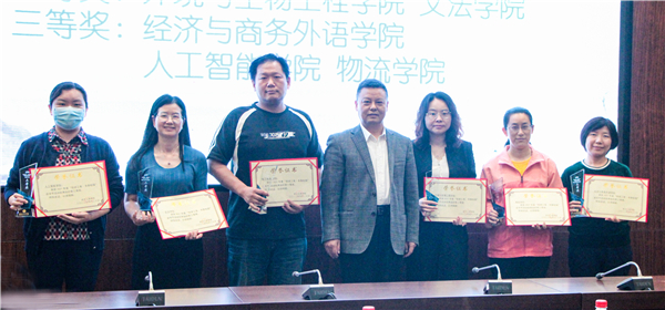 狄奥校助宣读了2021年“悦读工商·书香校园”读书节活动优秀组织奖获奖名单:电商学院荣获一等奖;环境与生物工程学院、文法学院荣获二等奖;物流学院、经济与商务外语学院、人工智能学院荣获三等奖。刘生元书记分别为获奖学院颁奖。