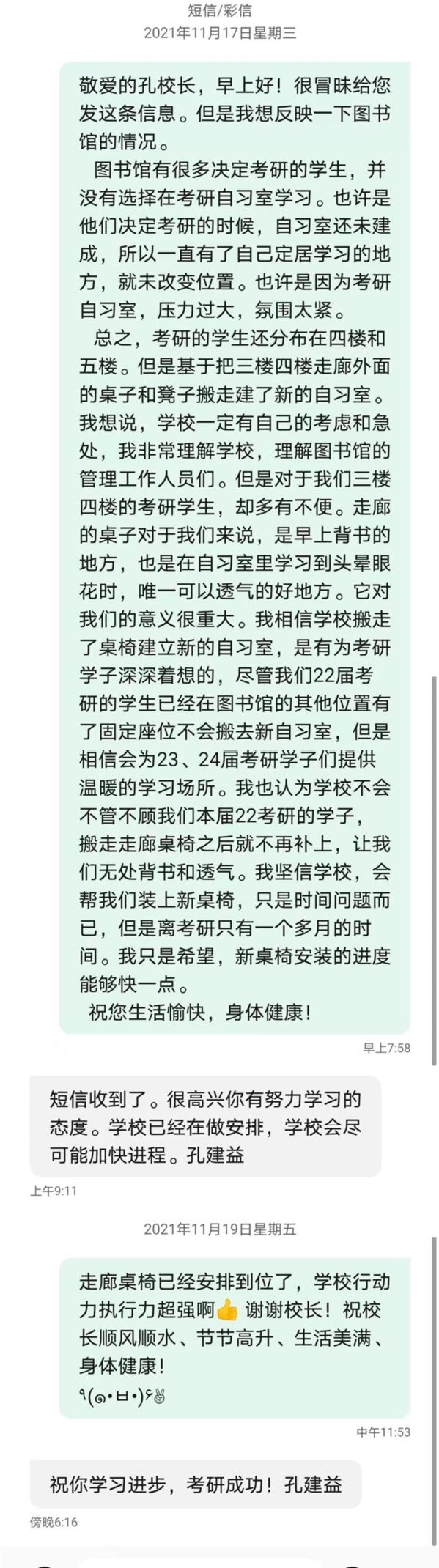 在覃娴发送短信的第三天,图书馆走廊就新增了桌椅,“不仅是全新的,还是升级版的。”覃娴说,考虑到同学们晚上在走廊上学习灯光有些暗,这些新桌椅上还加装了护眼灯。而在学校图书馆加装自习桌椅的同时,学校花了4天时间改造出一间新的考研自习室,并在考研季将开馆时间从每天6:30提前至6时,解决了考研学生的后顾之忧。后来,覃娴通过询问发现,原来身边很多同学都给校长发过短信,也都一一收到了回复。