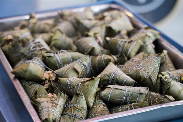 当天上午10:30,食堂工作人员经过一上午紧张忙碌的工作,为同学们准备好了热乎乎的八宝粽、红豆粽、蜜枣粽等。前来领取粽子的师生们都开心不已,有的当场剥开粽子咬上一口,软糯香甜,频频点赞。
