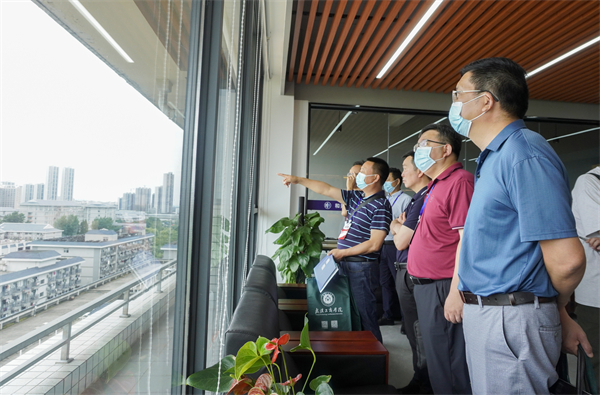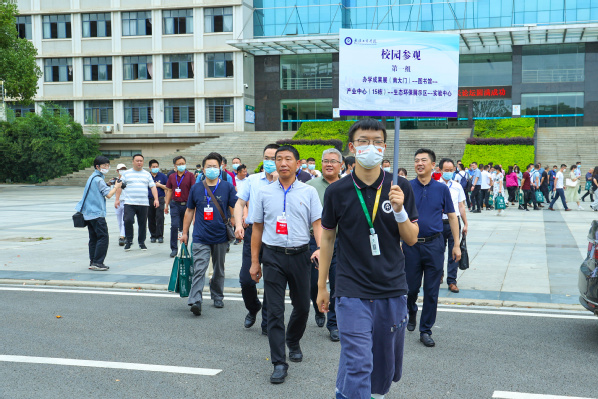 图为县域高中校长跟随志愿者参观校园 摄影:张焰