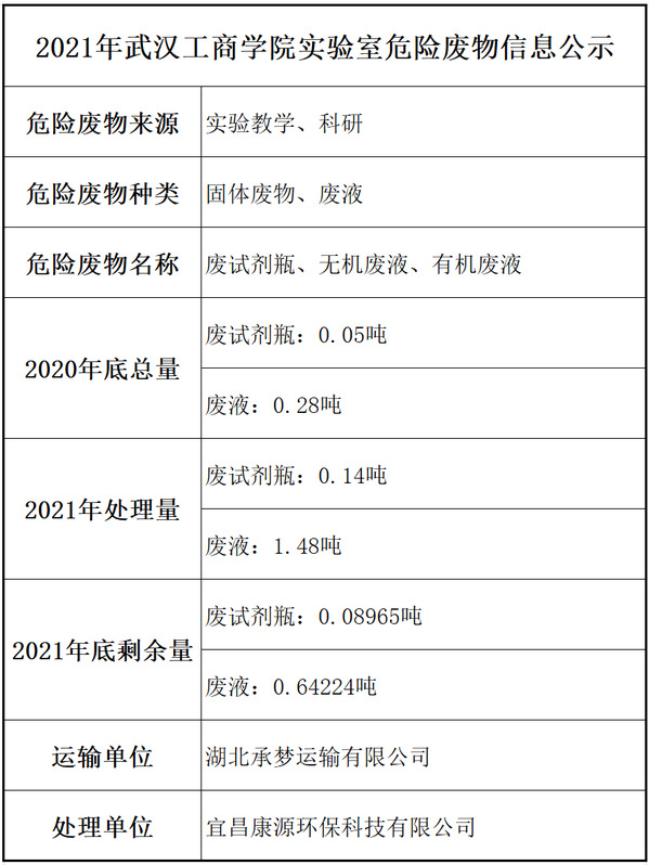 2021年武汉工商学院实验室危险废物信息公示