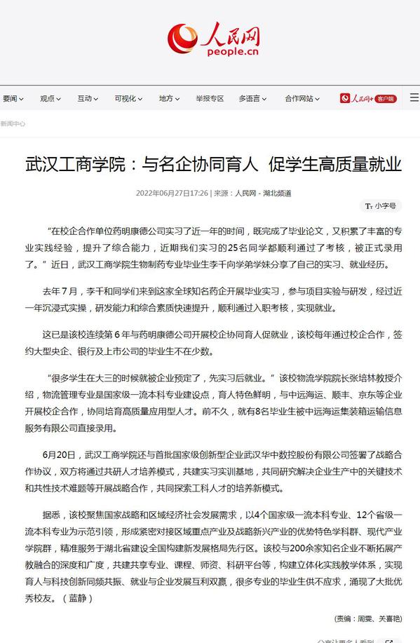 “在校企合作单位药明康德公司实习了近一年的时间,既完成了毕业论文,又积累了丰富的专业实践经验,提升了综合能力,近期我们实习的25名同学都顺利通过了考核,被正式录用了。”近日,武汉工商学院生物制药专业毕业生李千向学弟学妹分享了自己的实习、就业经历。