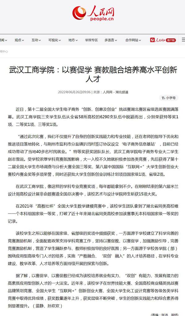 “通过此次比赛,我们不仅提升了自身的创新实践能力和专业技能,还在老师的指导下优化和推进项目落地转化,与荆州市监利市分盐镇扒垱村签订协议设立‘电子商务信息基站’,目前已经成功带动了当地40多名村民就业。”特等奖获奖团队队长、武汉工商学院电子商务专业大二学生赵志雪说。受学校浓厚学科竞赛氛围影响,大一入校不久她就积极参加各类竞赛,先后获得了第十二届全国大学生市场调查与分析大赛全国三等奖、第八届中国国际“互联网+”大学生创新创业大赛校内赛金奖等多项荣誉,同时还获批大学生创新创业训练计划项目国家级1项、省级2项。