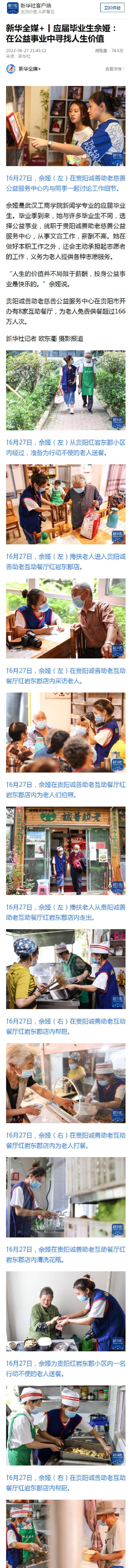 佘娅是武汉工商学院新闻学专业的应届毕业生。毕业季到来,她与许多毕业生不同,选择公益事业,就职于贵阳诚善助老慈善公益服务中心,从事文宣工作,薪酬不高。她在做好本职工作之外,还会主动承担起志愿者的工作,义务为老人提供各种志愿服务。