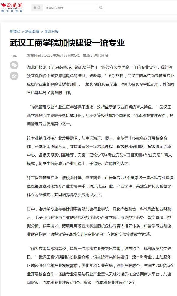 “物流管理专业毕业生每年都供不应求,这得益于该专业鲜明的育人特色。”武汉工商学院物流学院院长张培林介绍,前不久该校获批4个国家级一流本科专业建设点,物流管理专业便是其中之一。