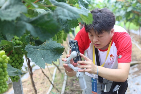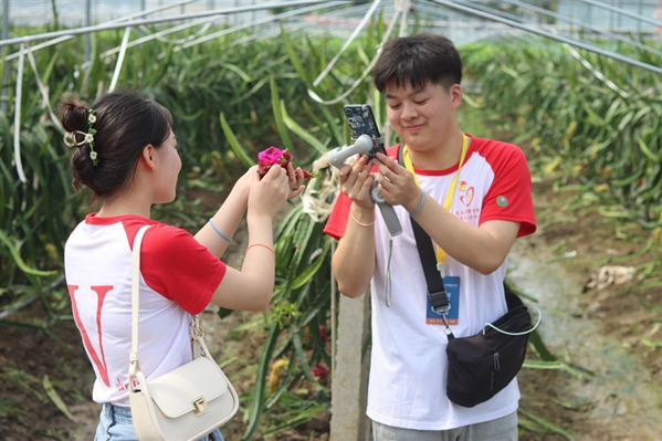 7月6日,市委文明办组织武汉工商学院校青协“萤火虫之光”志愿服务队走进龙湾镇龙新村、双丰村,开展以“助力乡村振兴,一起助农前行”为主题的实地考察活动。在龙新村火龙果种植基地,志愿者们及龙湾镇政府相关工作人员一起参观了火龙果的种植环境,认真听取当地农户的介绍,了解产品的特点、种植规模、生长周期等情况,随后以“全媒体+直播+短视频”营销新模式,依托互联网技术,助力乡村振兴。记者 赵天祥 通讯员 王思娅 周纤慧 摄