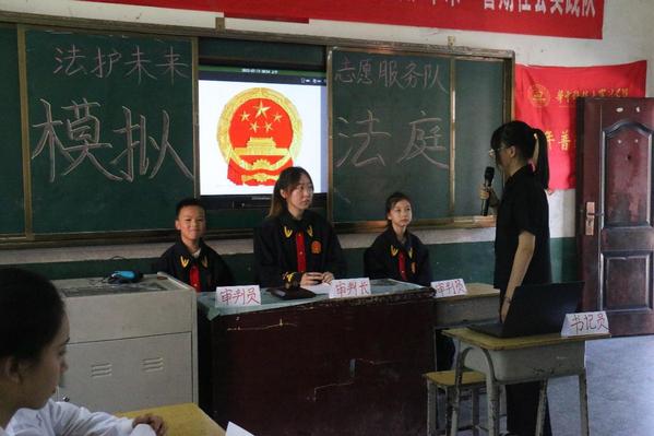 华中科技大学“法护未来”志愿服务队为孩子们开设模拟法庭。