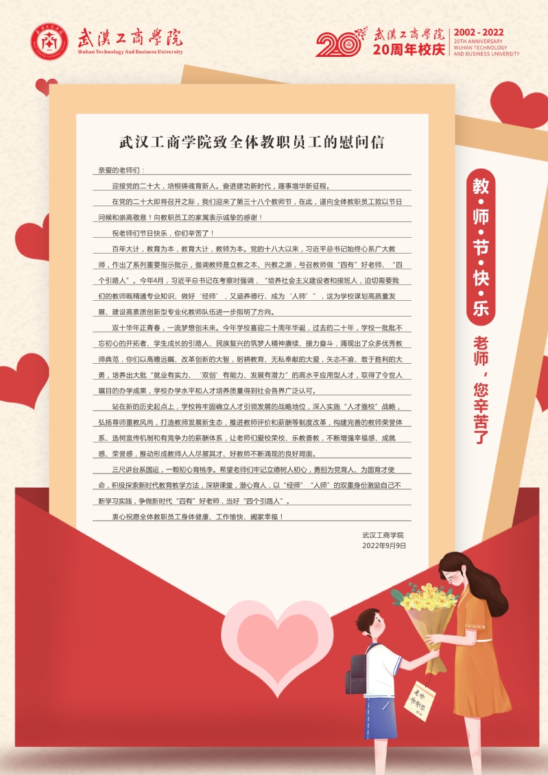 在党的二十大即将召开之际,我们迎来了第三十八个教师节,在此,谨向全体教职员工致以节日问候和崇高敬意!向教职员工的家属表示诚挚的感谢!