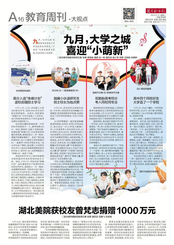 楚天都市报极目新闻讯(通讯员 汪旸 汪欣怡)拥有相似的长相和身高,以同样的高考分数被武汉工商学院视觉传达设计专业录取,9月10日中午,来自湖北荆州的双胞胎姐妹花平文静和平文雅到校报到,吸引了老师和同学们的目光。