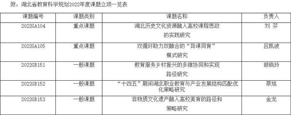 (通讯员 张黎力)近日,湖北省教育厅下发了《省教育厅关于下达省教育科学规划2022年度课题的通知》(鄂教科规〔2022〕1号),武汉工商学院共有5项课题获批立项,其中重点课题2项,一般课题3项。立项数量居湖北省同类高校前列。