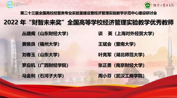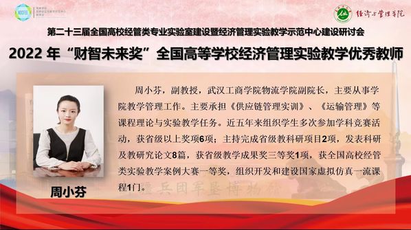 新闻中心讯(特约记者刘佳欣 记者杨小婷)10月29—30日,第二十三届全国高校经管类专业实验室建设暨经济管理实验教学示范中心建设研讨会以线上会议的形式召开,会上,武汉工商学院物流学院副院长周小芬副教授被授予2022年全国经管类实验教学“财智未来奖”优秀教师称号。
