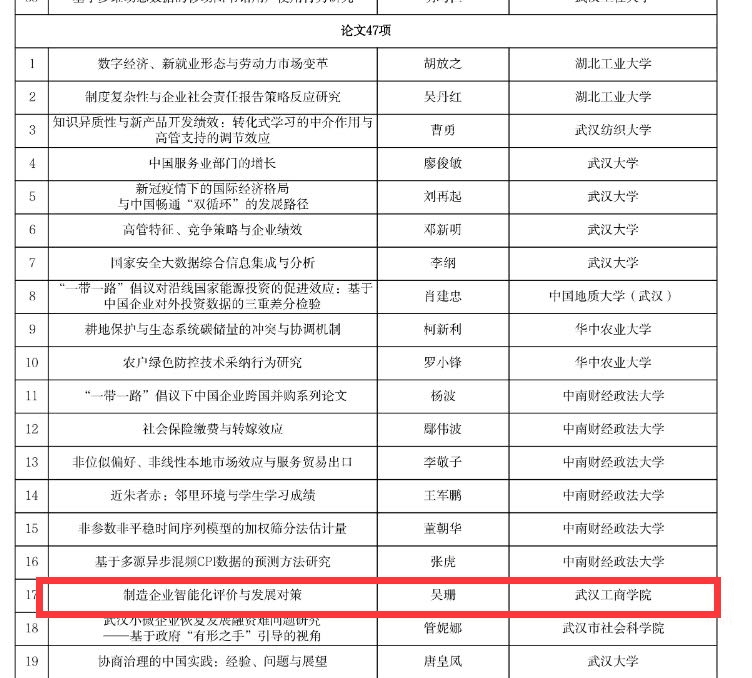 新闻中心讯(特约记者 王敏)近日,武汉市第十八次社会科学优秀成果奖公示结束,武汉工商学院公共课部教授吴珊的《制造企业智能化评价与发展对策》系列论文荣获三等奖,这也是该教授继湖北省第十三届湖北省社会科学优秀成果获奖后新突破。