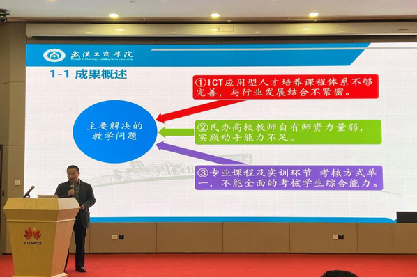 其中,胡成松教授做了主题为《基于“双主体五融合”的民办高校ICT应用型人才培养路径探索与实践》的报告,分享了武汉工商学院人工智能学院构建校企双主体的协同育人模式,推动学生的学业、专业与企业、产业、行业深度融合,搭建“专业课程+行业课程”的课程体系,构建以综合能力素质考核为主的课程评价方式改革等亮点和成果。