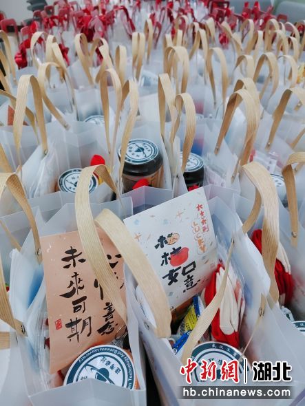 中新网湖北新闻12月13日电 (蓝静) 12月12日下午,在武汉工商学院图书馆前广场上,该校环境与生物工程学院的老师们为83名考研学生送上满载祝福的“考研加油福袋”,里面既有N95口罩、酒精等防疫物品,也有暖宝宝、奶茶、厚棉袜等贴心礼物,学生们收到后纷纷赞叹,学院的暖心举措让人振奋又温暖!