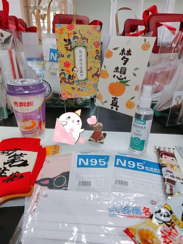 福袋也包含了学院校友对学生的关心和祝福,其中的N95口罩、酒精等是学院2014届校友陈成前两天送过来的,目的是为了让学弟学妹们能够更顺利地参加考试。此前,他曾于2019年1月为经济困难的学弟学妹们送过爱心车票用于返乡,2020年3月送过5000多斤蔬菜支持学校的防疫工作。