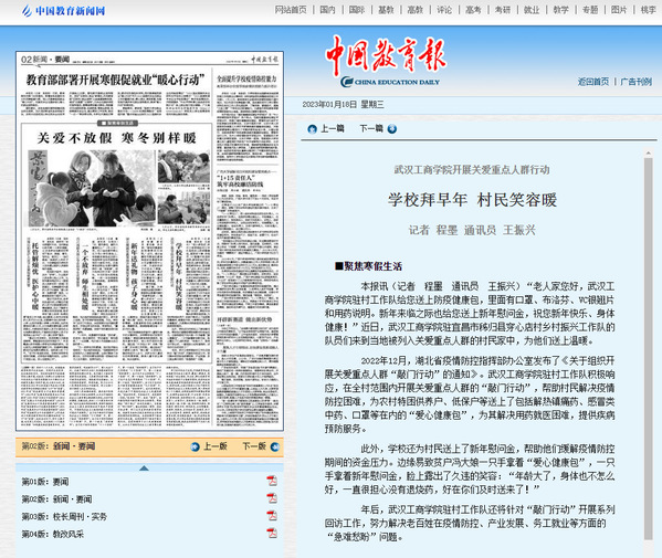 本报讯(记者 程墨 通讯员 王振兴)“老人家您好,武汉工商学院驻村工作队给您送上防疫健康包,里面有口罩、布洛芬、VC银翘片和用药说明。新年来临之际也给您送上新年慰问金,祝您新年快乐、身体健康!”近日,武汉工商学院驻宜昌市秭归县穿心店村乡村振兴工作队的队员们来到当地被列入关爱重点人群的村民家中,为他们送上温暖。