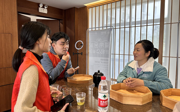 学生与九畹丝绵茶厂的工作人员交流。 谢惠卉 摄