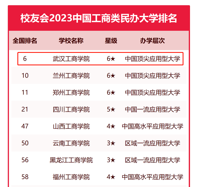 新闻中心讯(记者 李洋洋)4月6日,艾瑞深校友会网正式发布《2023校友会中国大学排名——高考志愿填报指南》。在最新校友会2023中国民办大学排名中,武汉工商学院办学实力最强、最具竞争力、办学水平最高,全国排名第6名,稳居校友会2023中国工商类民办大学排名榜首;学校荣膺2023中国六星级民办大学,办学层次为中国顶尖应用型大学,学校的综合办学实力、人才培养水平与社会声誉逐年攀升。