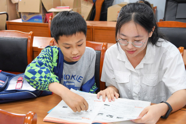 英语俱乐部同学正在教社区孩子读英文 摄影:陈梓诺