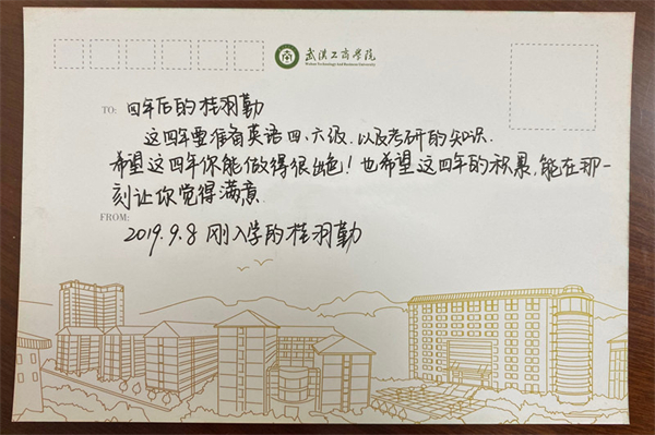 近日,武汉工商学院管理学院2023届毕业生桂羽勤考取了华中师范大学土地资源管理专业硕士研究生,得知考研成功的消息后,她收到了学校给她的一份礼物。4年前进入大学时自己写给自己的信,上面写着曾今的梦想:这四年要准备英语四、六级,以及考研的知识,希望这四年你能做得很出色!