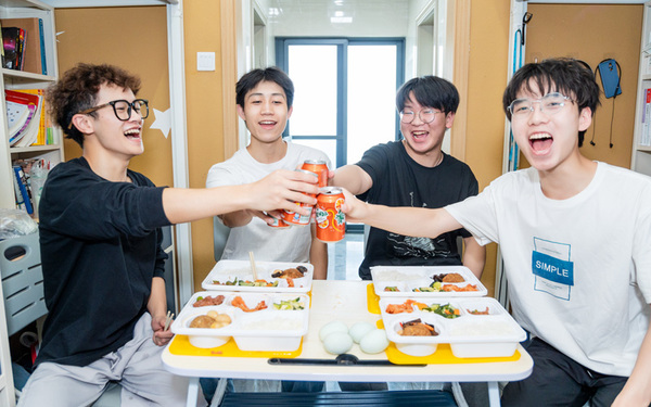学校计算机与自动化学院大三学生张晓阳领到校庆餐后和同学们一起在寝室里为学校庆祝生日,他说:“校庆餐饭菜种类丰富、荤素搭配、营养美味,看得出来准备得非常用心,让我感觉到学校是一个温暖的大家庭。”