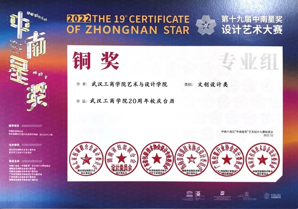新闻中心讯(记者 刘婕)近日,第十九届“中南星奖”设计艺术大赛结果揭晓,由武汉工商学院宣传策划部策划制作,艺术与设计学院教师黄家昶指导,学生高依妮设计的作品《武汉工商学院20周年校庆台历》荣获文创设计类专业组铜奖。