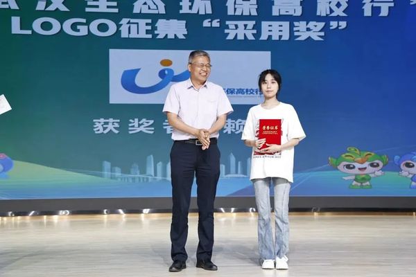 武汉市生态环境局党组成员、副局长任宪友为“武汉生态环保高校行”LOGO设计“采用奖”获奖者赖欣颁发证书